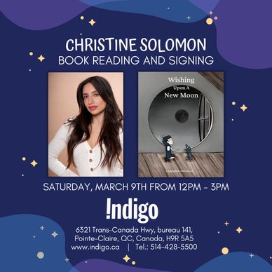 Come and join Christine at Indigo on Saturday March 9th from 12pm-3pm for a fun book reading and signing of WISHING UPON A NEW MOON.